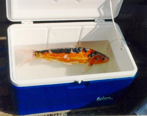 Here Paco is going under the anesthetic in a large ice chest, filled with highly-oxygenated pond water and 5 drops oil of clove per gallon of water. After about 10 minutes, Paco was rolling upside down. His gill function was always strong. |