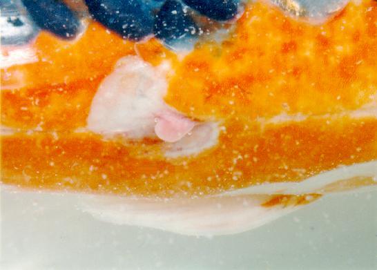 | Here's another close-up of tumor, but this time Paco's out of the water. The growth was about 3/8 inch by 1/4 inch. It was smooth and firm to the touch. The tumor appeared more red when viewed from this position, but was milky-translucent in color when viewed from the side. |