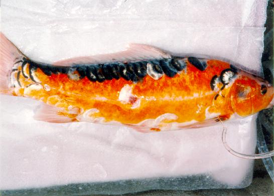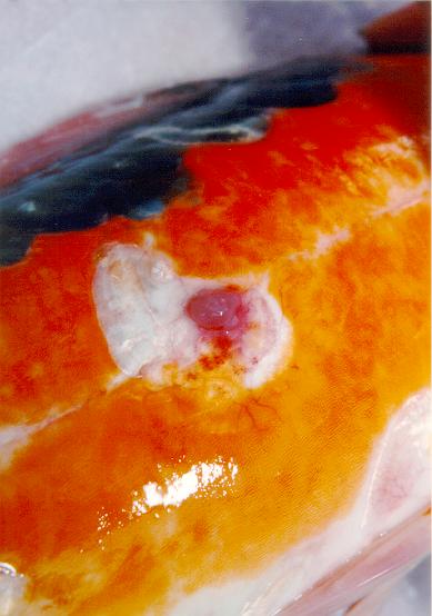 | The picture, however, fails to show the mercurochrome stains on me from when he flopped his tail after I applied it to his wound. I didn't add any antibiotics to the water, nor did I inject him with any. I've kept the water salted and he appears fine. Again, I freely admit that I didn't really know what I was doing, although everything went smoothly. I regret not having Doc Johnson's Book before this surgery. He was kind enough to review this page and thought the growth was probably a viral papilloma, lymphocystis lesion, or maybe even Carp pox. Doc said serious (malignant) skin cancers in Koi are rare. I wouldn't hold anyone to a diagnosis over the Internet but Doc Johnson's opinions are appreciated. I'll post any comments any knowledgeable Koi person wishes to offer. | |