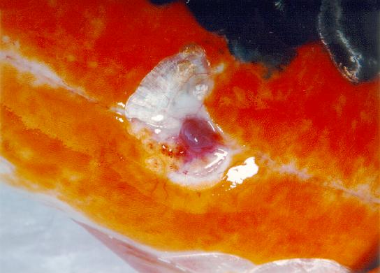 | Here's another close-up of tumor, but this time Paco's out of the water. The growth was about 3/8 inch by 1/4 inch. It was smooth and firm to the touch. The tumor appeared more red when viewed from this position, but was milky-translucent in color when viewed from the side. |
