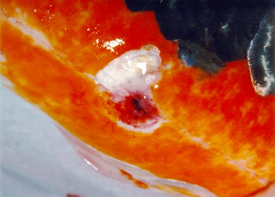 | Paco didn't flinch while the growth was being excised. While out of the water, his gill function remained strong and he occasionally flopped his tail. After the growth was excised, I applied mercurochrome to the site. Perhaps potassium permanganate would have been better, but I was unable to locate any. | |